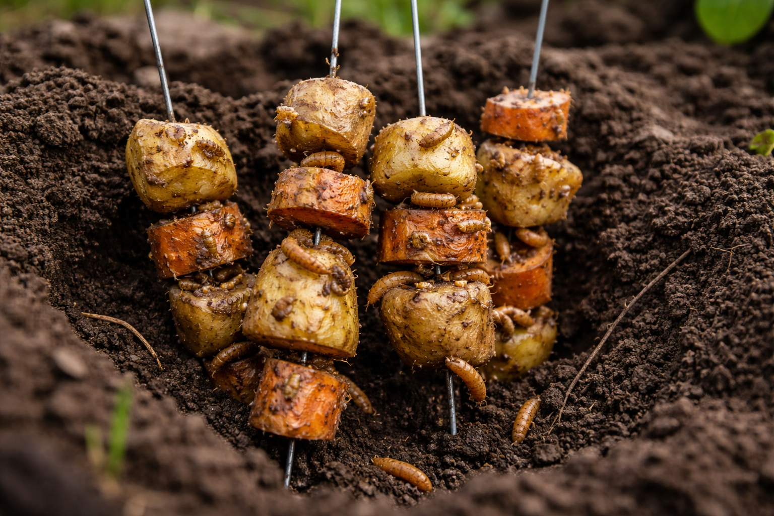 Så snart marken börjar värmas upp, trådmask vaknar upp med en enorm aptit. Det är då skadedjuret är som mest sårbart och vi kan spela på dess behov av mat. I stället för att vänta på att larverna ska nå de unga plantorna matar vi dem tidigare.