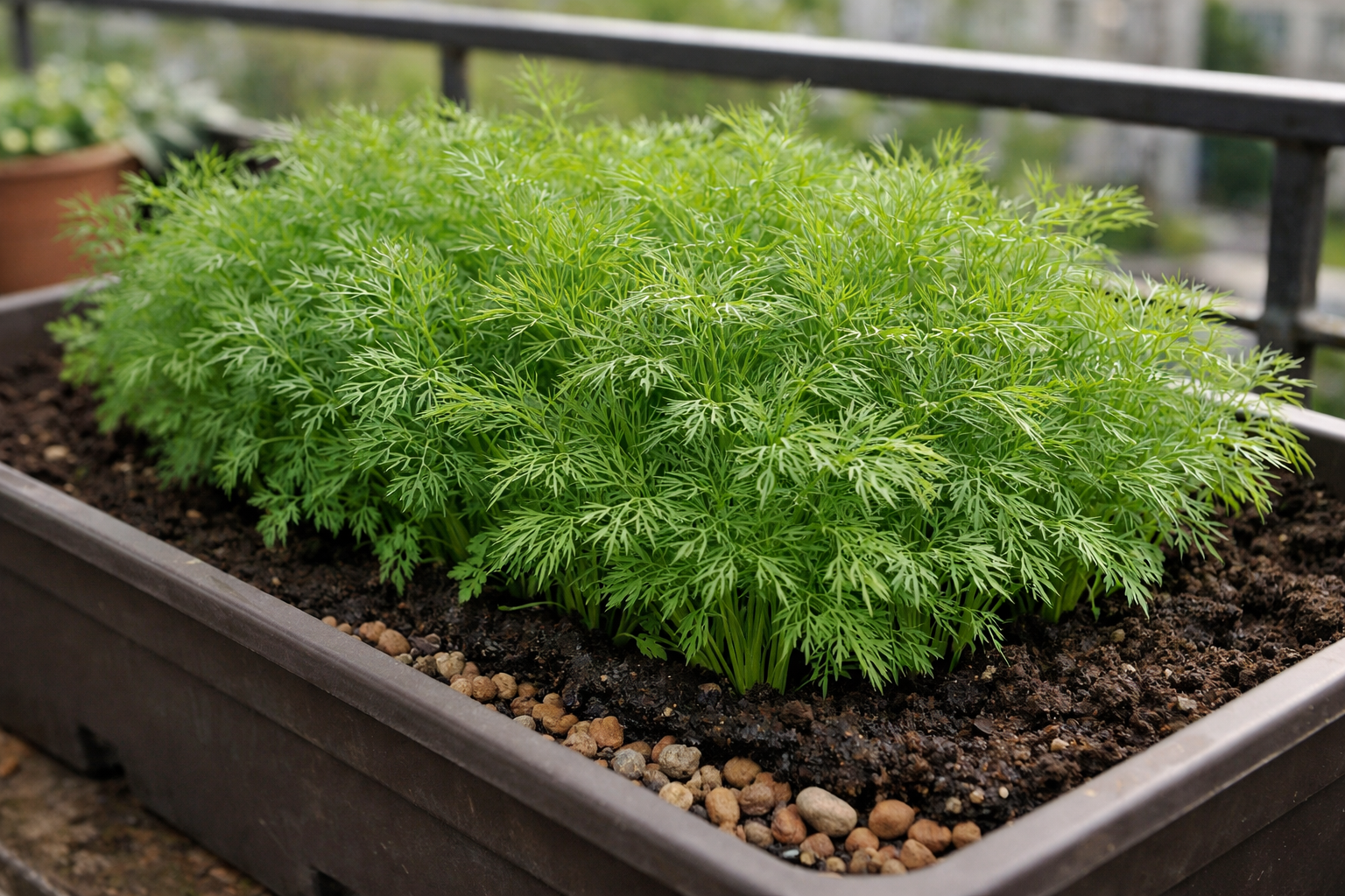 För en lyckad start balkong trädgårdsskötsel Valet av en lämplig behållare är avgörande. Rotsystemet hos denna krydda kräver tillräckligt med utrymme, så små koppar är inte lämpliga. Praxis visar att de bästa resultaten uppnås med långa balkonglådor.