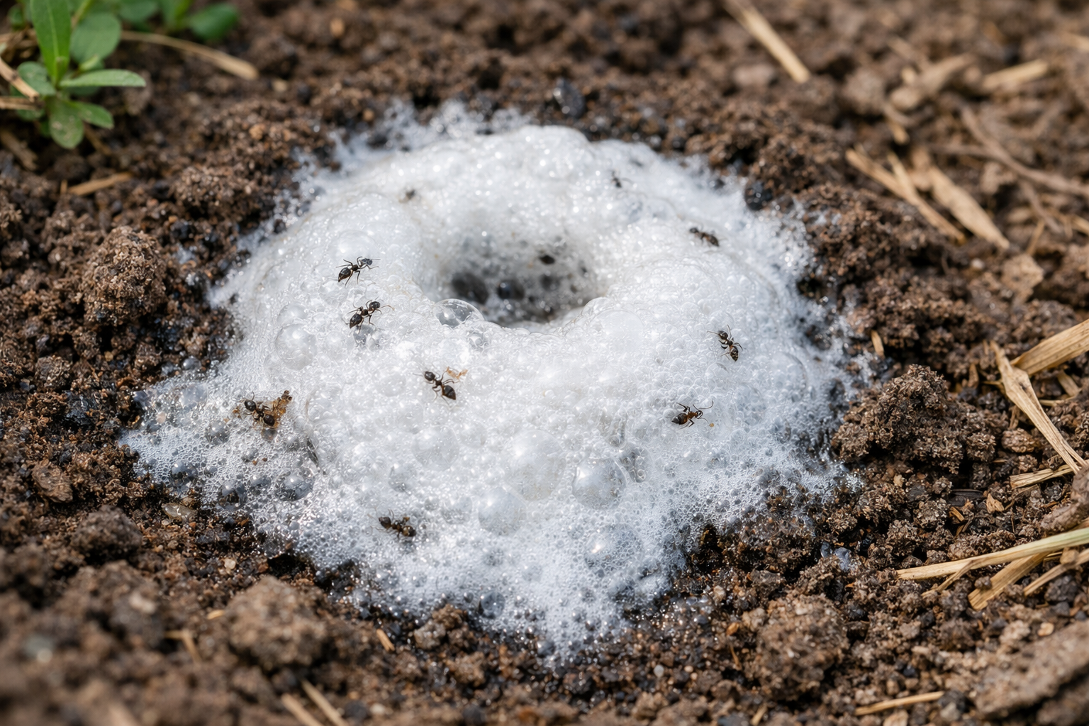 Den viktigaste hemligheten bakom framgången ligger i den våldsamma kemiska reaktionen mellan dessa två ingredienser inne i myrstacken. Det fräsande skummet skrämmer inte bara skadedjuren, det tränger omedelbart in i djupa passager och når den plats där myrorna gömmer sig Myra kompis.