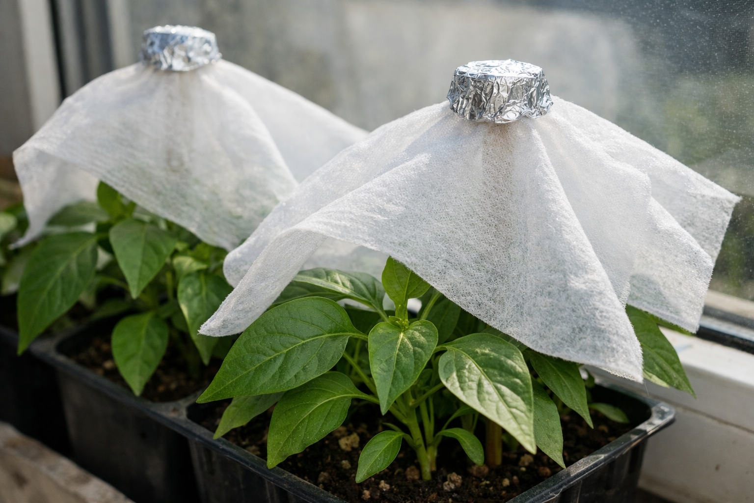 Spänn en tunn vit fiberduk direkt över behållarna.