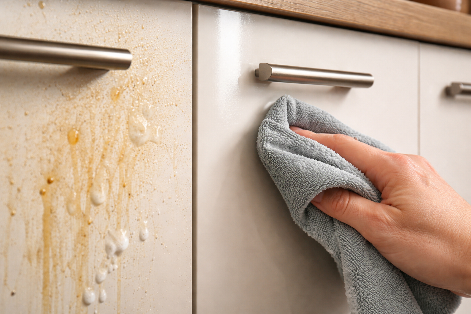 Hemlighet: Spraya aldrig flytande rengöringsmedel direkt på skåpsluckan. Spraya endast skummet på själva mikrofibern, så att det inte kommer in fukt i skarvar och kanter, vilket kan leda till att materialet sväller oåterkalleligt.
