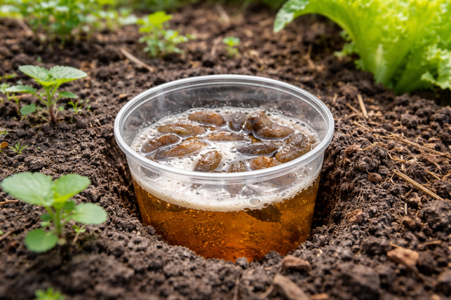 Var noga med att låta koppens kant vara ett par centimeter ovanför marken så att en jordlöpare eller en nyttobagge inte av misstag faller ner i vätskan.