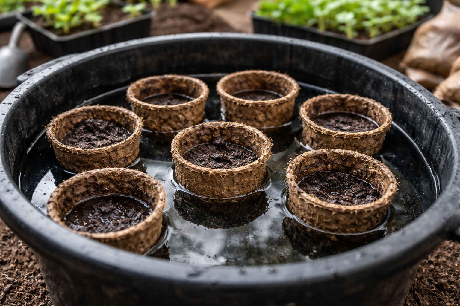 Innan du fyller på med jord ska du blötlägga den tomma behållaren i rent vatten tills den är helt mättad med fukt.