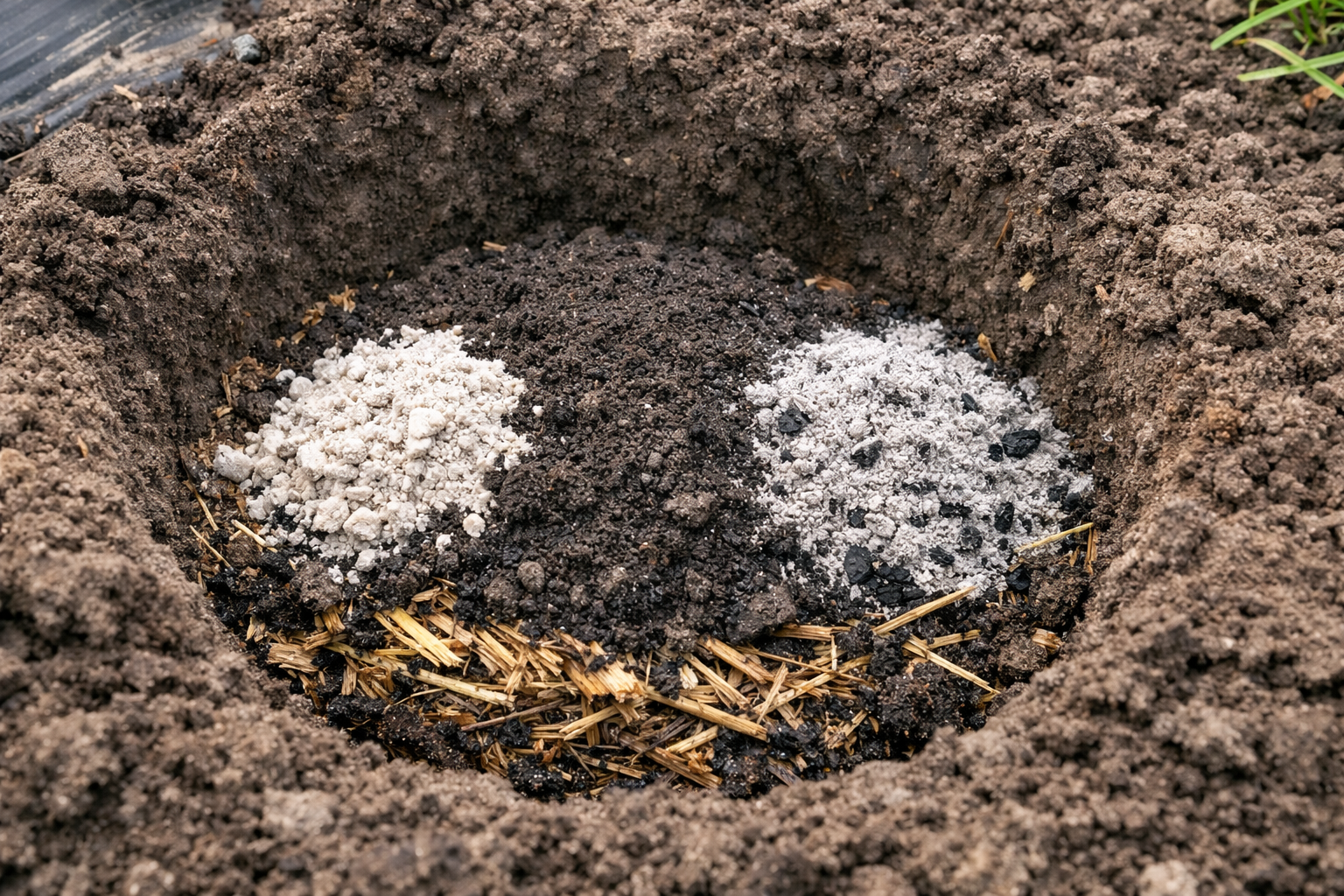 För att skapa en varm kudde i botten av hålet läggs organiskt material, som när det smälts avger mjuk värme. Ett lager jord måste hällas ovanpå för att inte bränna plantornas späda rötter.