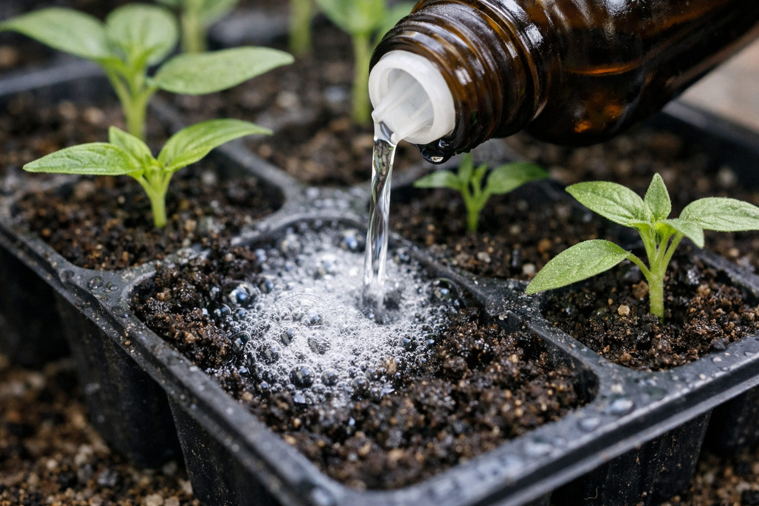 När vi odlar växter i en begränsad mängd jord är huvudproblemet följande syrebrist. Jorden packas, rötterna kvävs och förruttnelseprocessen inleds. Väteperoxid (H2O2) är mycket lik vatten i sin kemiska formel, men har en ”extra” syreatom. Det är denna fria atom som, när den släpps ut i jorden, gör verkliga underverk med rotsystemet.