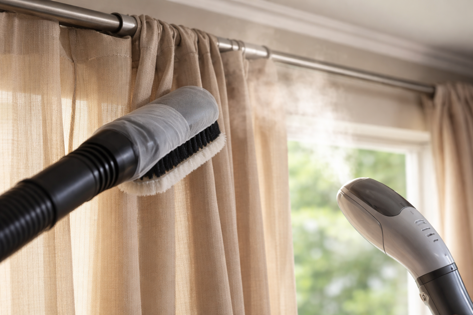Var särskilt uppmärksam på djupa veck, draperier och gardinstångens övre kant, där det mesta dammet samlas.
