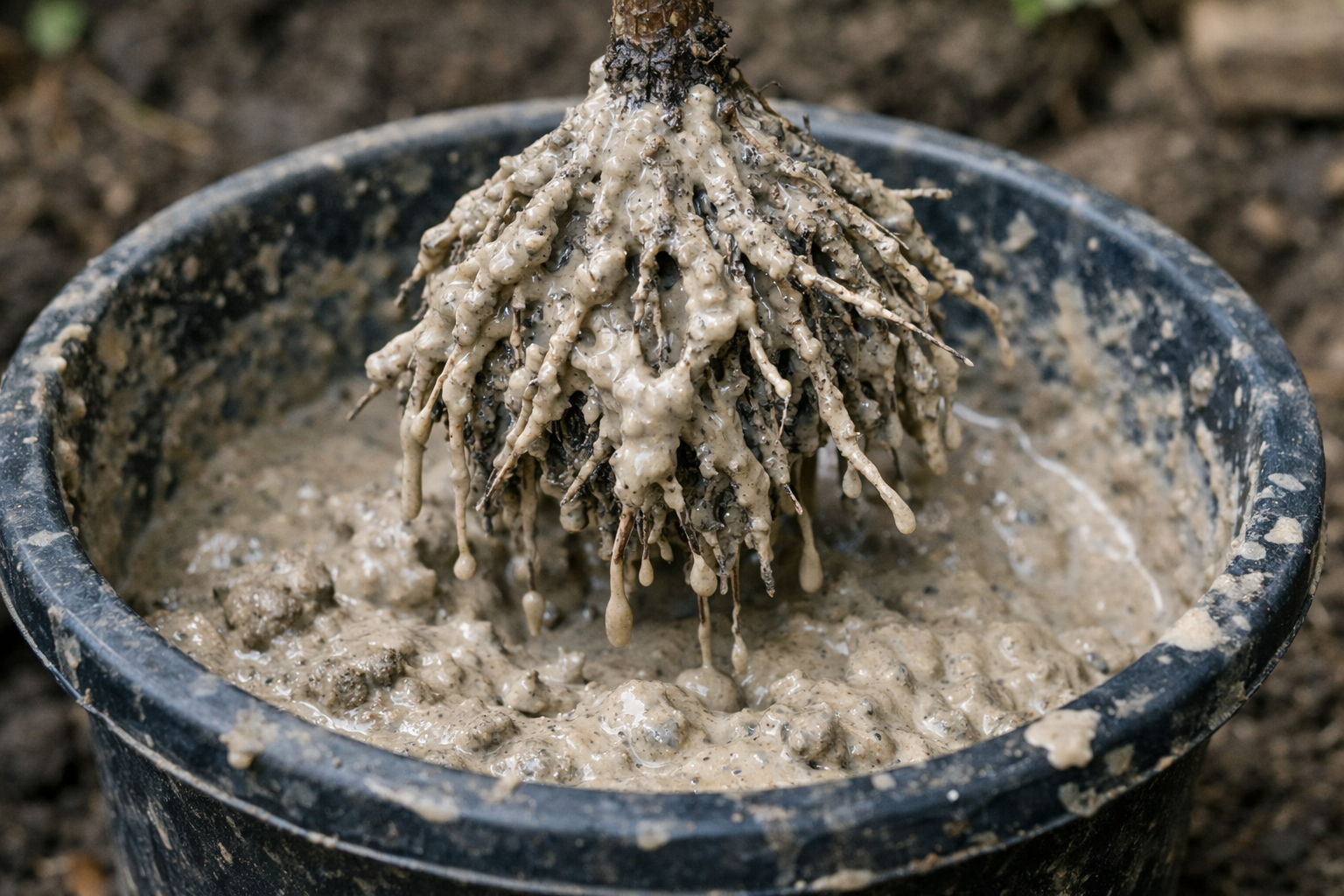 När planteringsmaterial grävs upp förlorar de små sugrötterna fukt direkt. Ute i det fria kan de dö på bara några tiotal minuter. Det är därför erfarna trädgårdsmästare alltid använder lera gipssom fungerar som en konstgjord skyddande kokong.