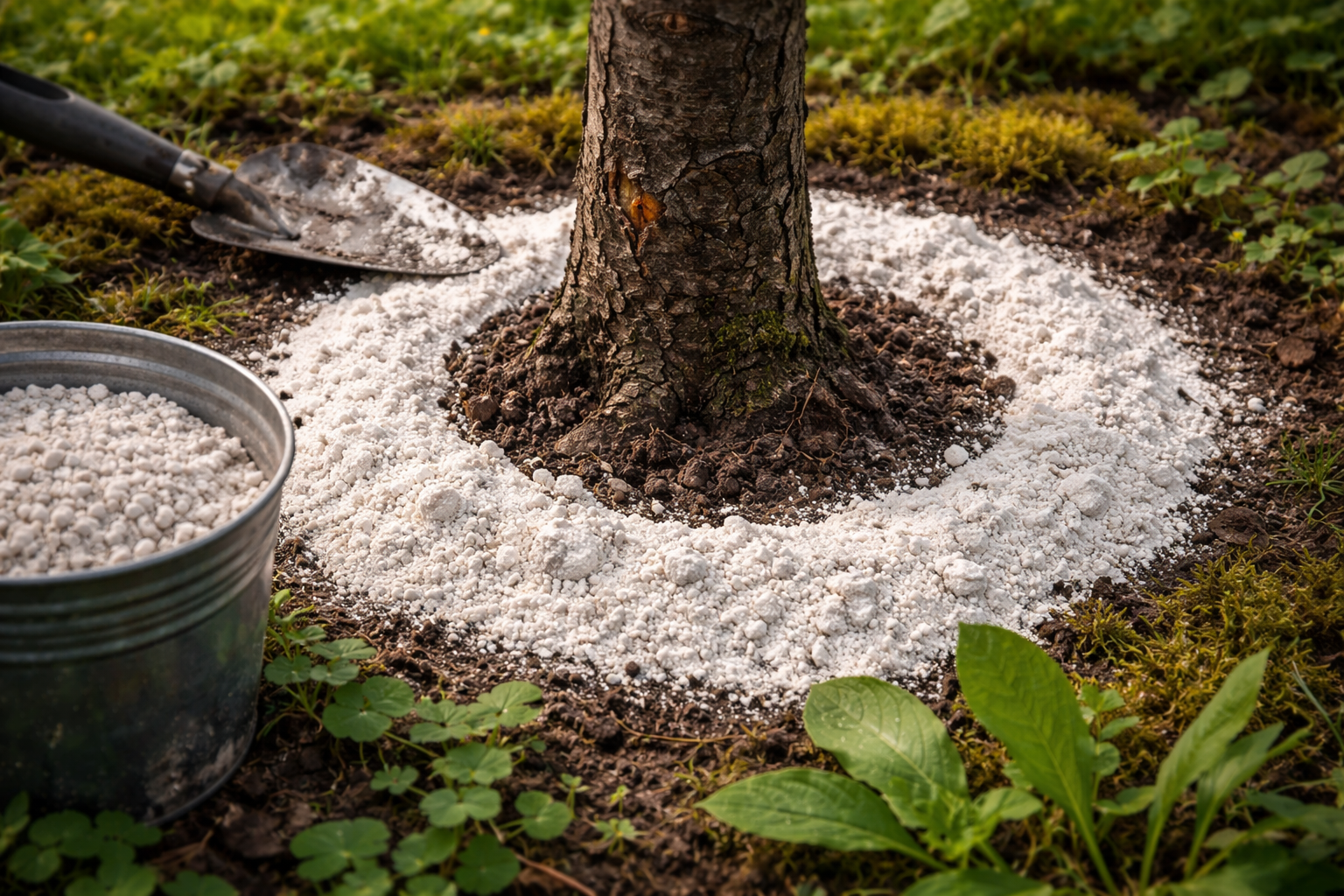 Kan man hälla torr kalk direkt på körsbärsträdens rötter när man planterar dem?