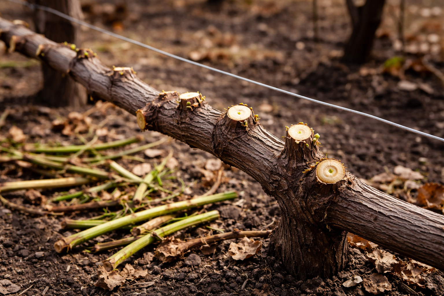 Klipp aldrig en vinstock med gröna blad, se till att vänta på naturligt bladfall så att busken har tid att ta alla näringsämnen från lövverket tillbaka till rötterna.