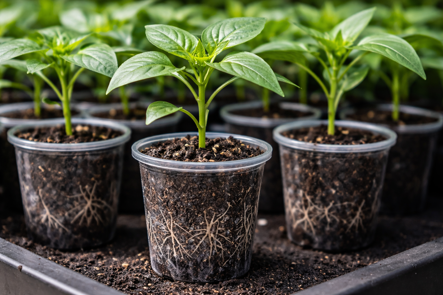Mörka behållare håller bättre kvar den värme som paprikan behöver, medan genomskinliga väggar gör det möjligt för odlaren att visuellt övervaka rotsystemets tillstånd.