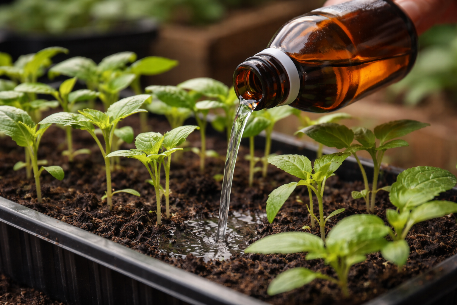 Det är viktigt att noga följa proportionerna för att inte bränna de känsliga håren i rotsystemet. För standardvård av tomater, paprika och auberginer är en mild koncentration idealisk. Det räcker att tillsätta två matskedar apoteksmedel till en liter tempererat vatten vid rumstemperatur. En sådan lösning bör inte förvaras under lång tid, eftersom de aktiva komponenterna snabbt förflyktigas.