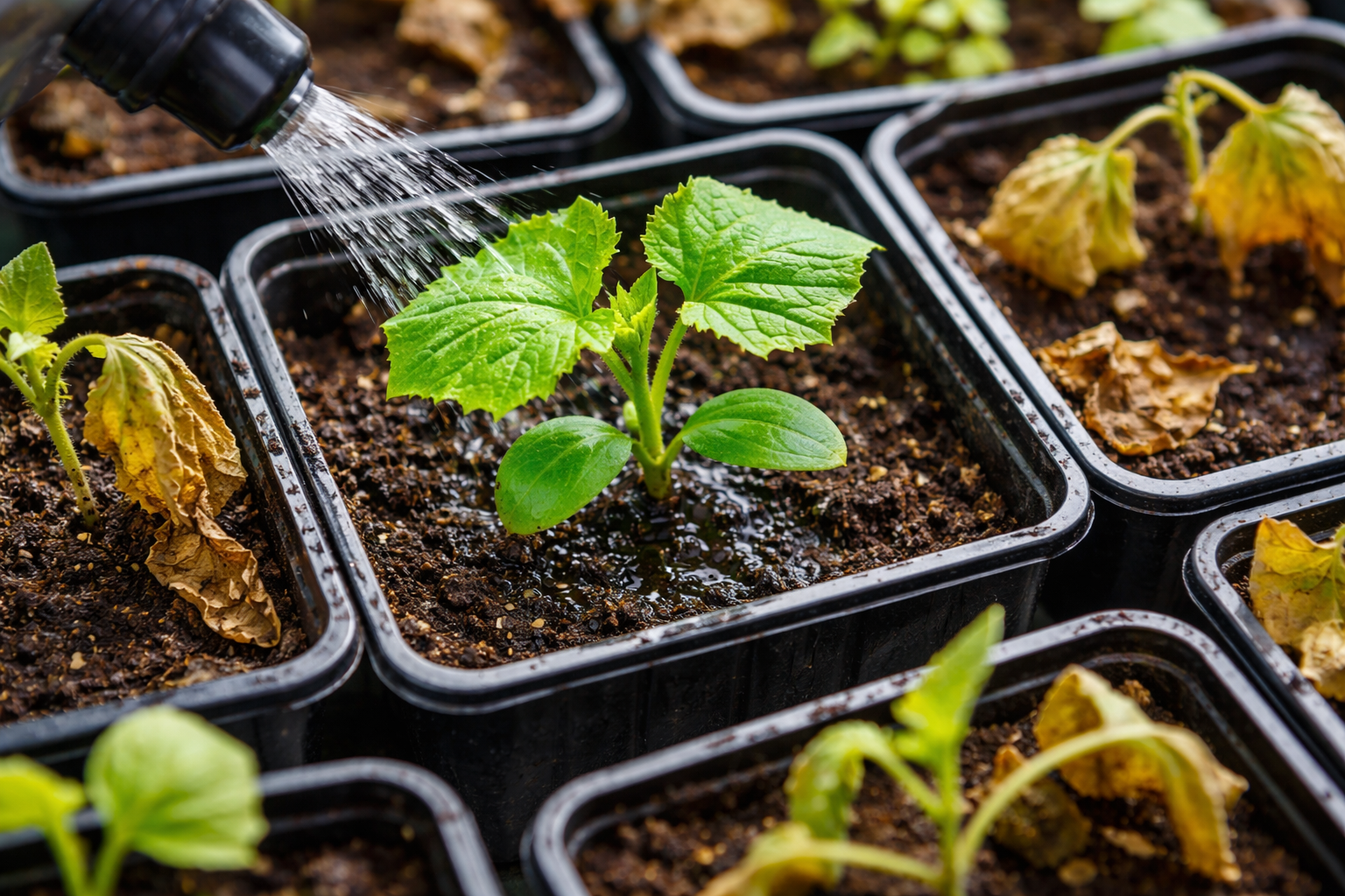 Korrekt vattning är en konst som kräver en strikt balans. Temperaturstress dödar plantor lika snabbt som torka. Vatten bör alltid hållas varmt.