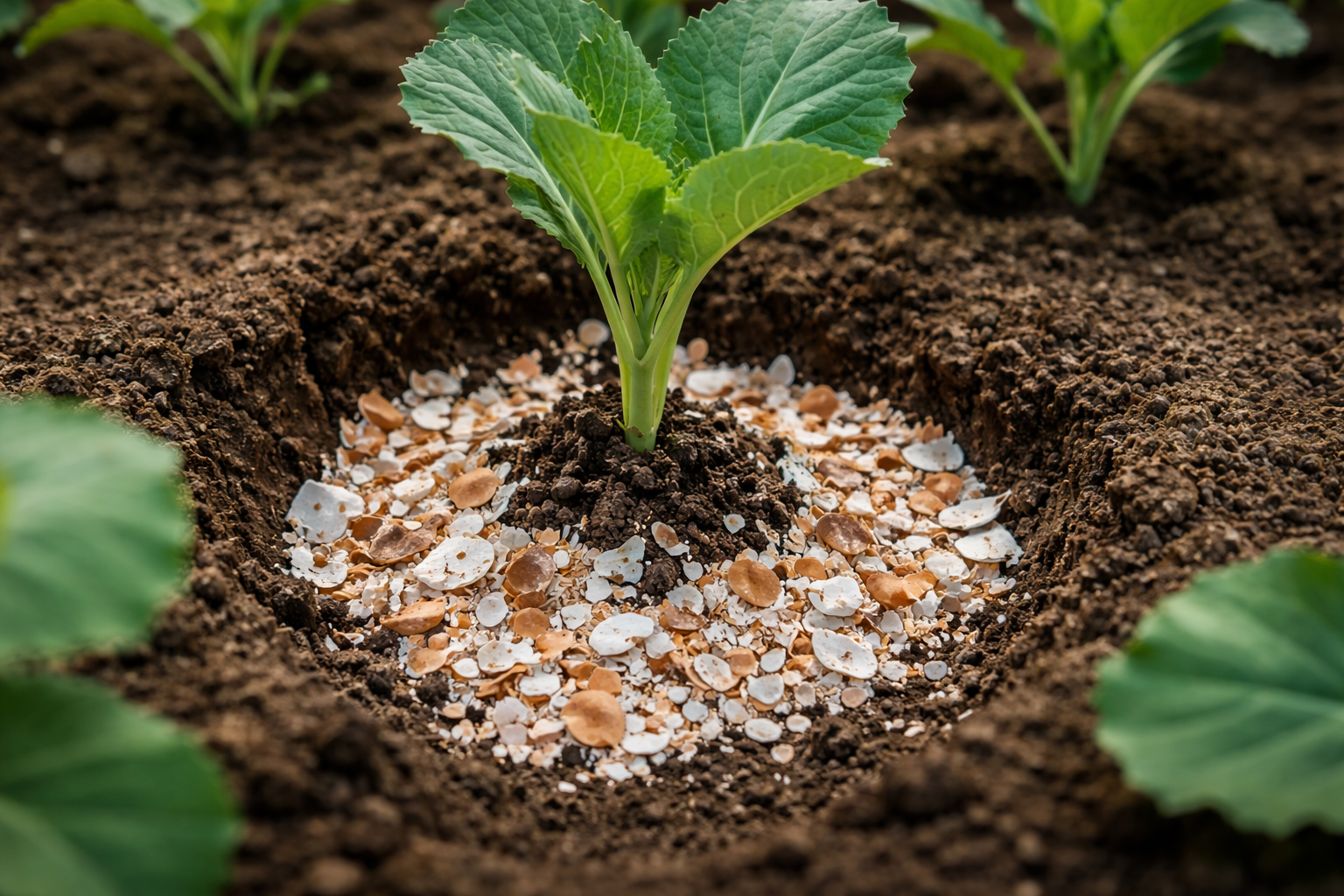 Förberedelserna för plantering börjar med att hålen bildas. En handfull organiskt pulver ska tillsättas i varje hål och blandas ordentligt med jorden så att rötterna inte rör vid det koncentrerade lagret.