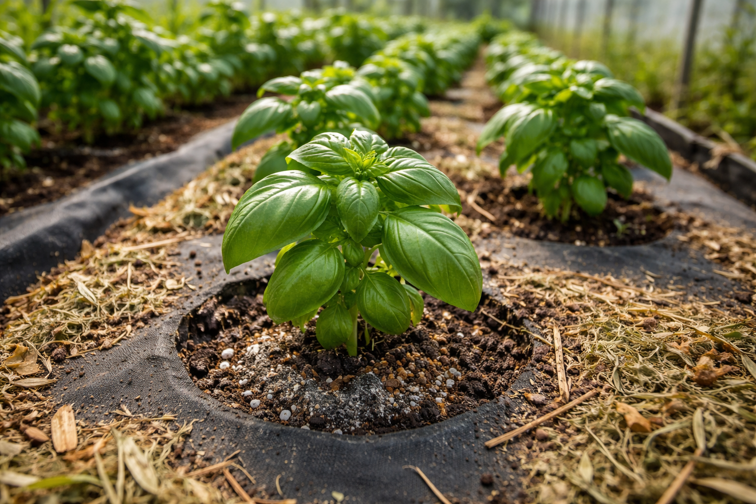 Använd ett tunt lager organisk marktäckning för att hålla kvar fukten vid rötterna