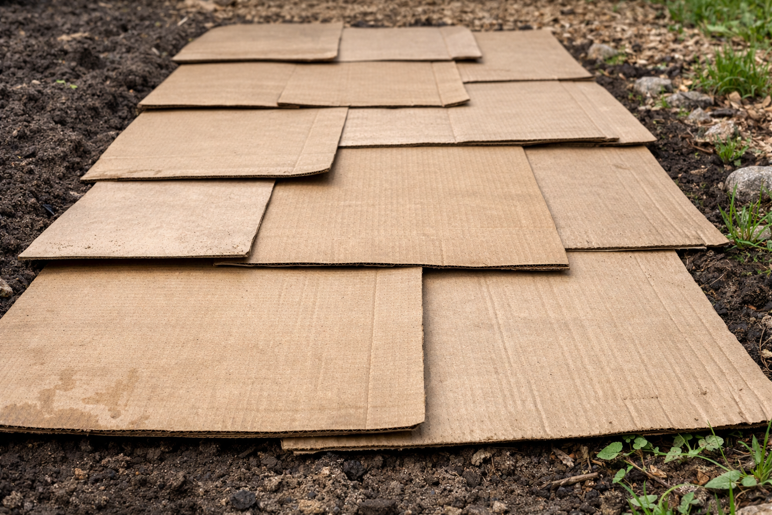 En av de mest effektiva metoderna anser jag vara att använda vanlig förpackningskartong. Det är ett miljövänligt material som under en säsong bryts ned och förvandlas till gödningsmedel, samtidigt som även aggressiva växter som vetegräs och maskros dämpas.