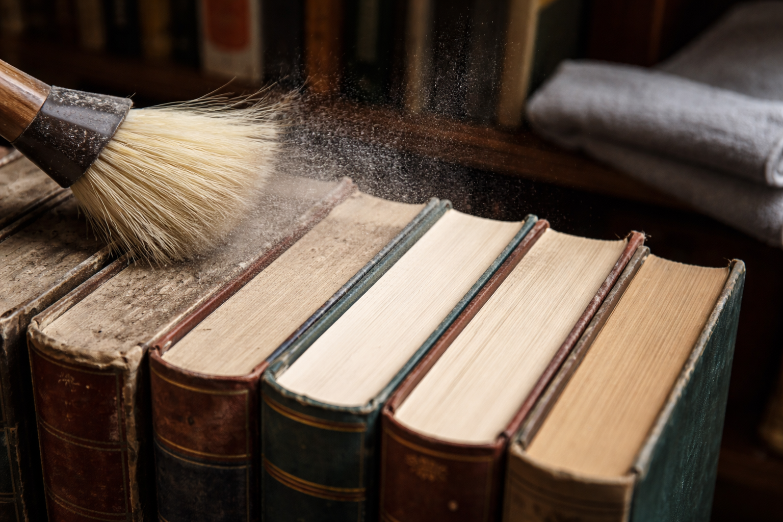 En viktig hemlighet: Håll alltid boken hårt med båda händerna när du dammar, så att små skräp inte faller djupt ner mellan sidorna.