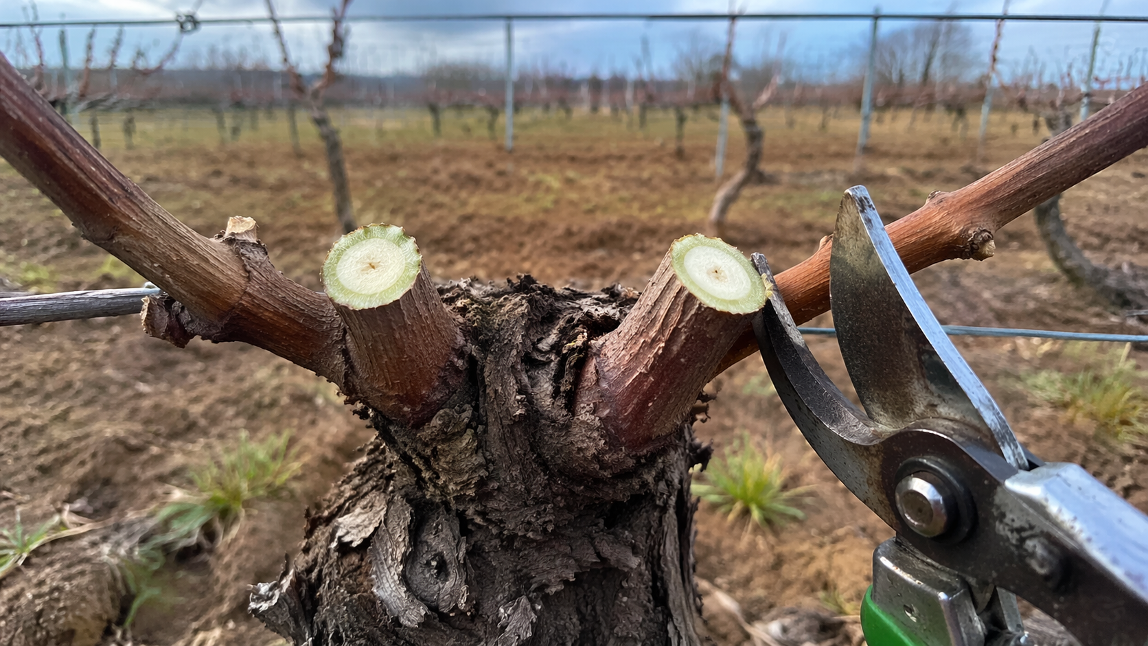 Vinrankan klipps så att det yttersta ögats tillväxtriktning pekar utåt från buskens mitt.