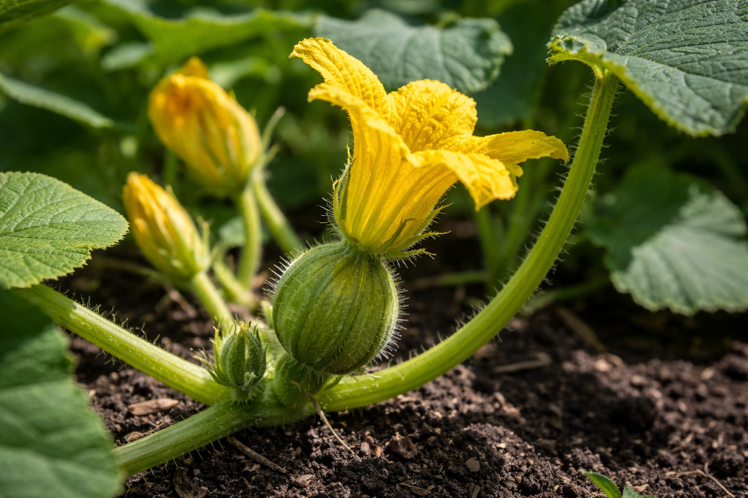 Den kvinnliga blomman har en märkbar visuell förtjockning vid basen i form av en liten rund pumpa.