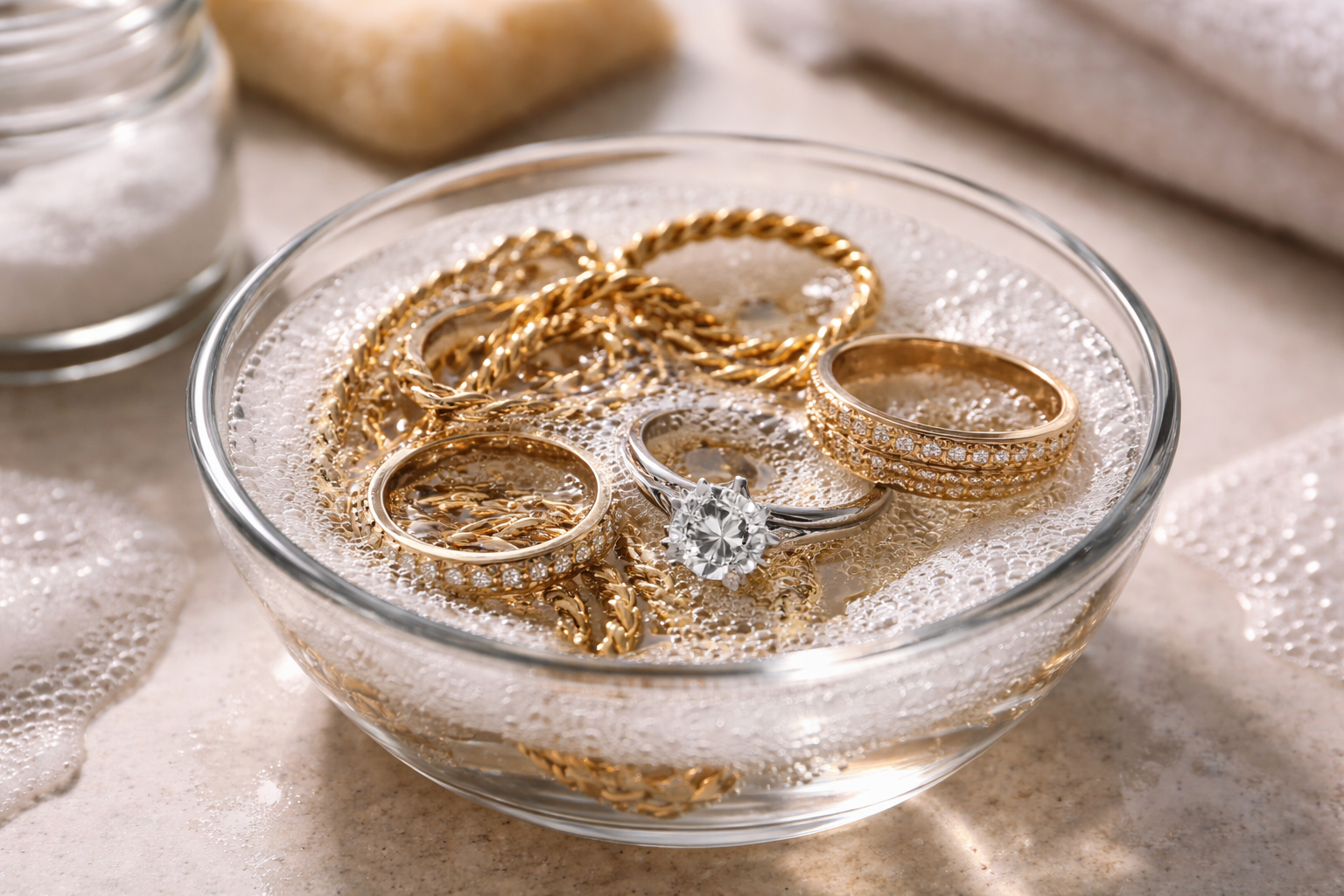 Den främsta hemligheten bakom perfekt rengöring ligger i vattnets temperatur, det bör vara måttligt varmt för att effektivt lösa upp hudfettet men inte skada smyckeslimmet som fixerar stenarna.
