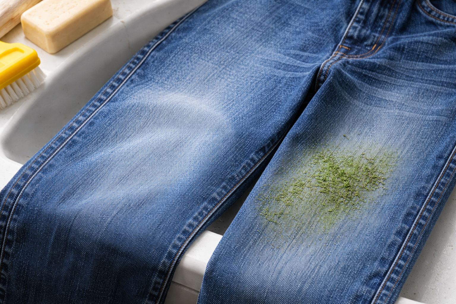 Viktig nyans: gnugga aldrig en färsk gräsfläck med en torr trasa, eftersom detta bara kommer att driva det frätande pigmentet djupare in i strukturen på denimtrådarna.
