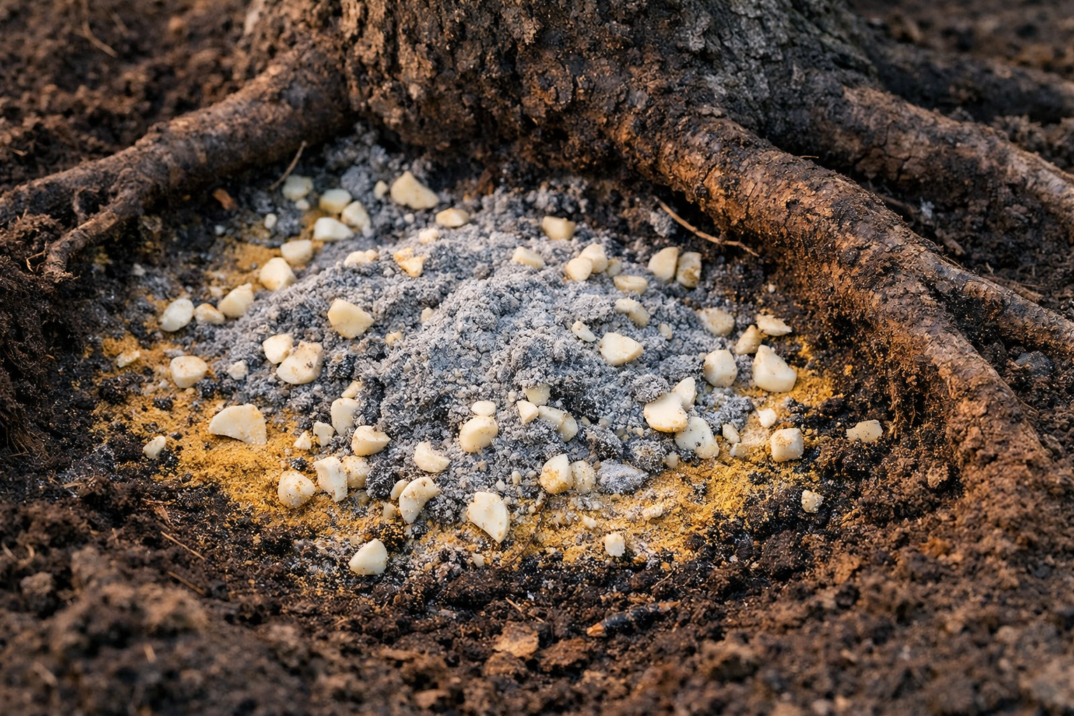 En lätt uppluckring till ett djup av högst fem centimeter är tillräckligt för att undvika att traumatisera trädet.