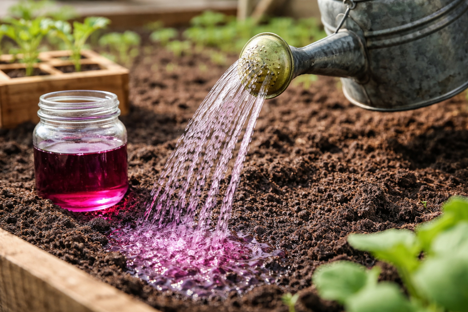 Vårens markberedning kräver särskild uppmärksamhet åt balansen mellan mikroflora. Marken efter vintern eller inköpt substrat innehåller ofta sporer av patogena svampar. Det är här hjälpen kommer in mangan. Det är inte bara ett kraftfullt antiseptiskt medel, utan också ett starkt oxidationsmedel som effektivt förstör infektioner på cellnivå samtidigt som det fungerar som en värdefull källa till kalium и mangan för unga växter.